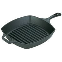 - Square cast-iron grill pan with ribbed bottom for low-fat cooking